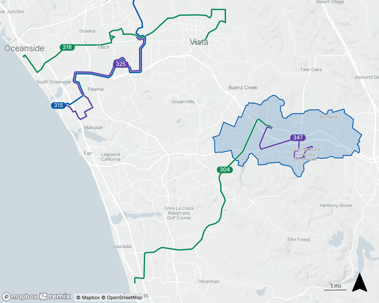 The proposed weekend standardization includes adding Sunday service to BREEZE Routes 304 and 318 (below in green) and the elimination of Saturday service for BREEZE Routes 325 and 347 (below in purple). Riders currently served by Route 325 would continue to be served by BREEZE Route 315 (in blue), while riders on Route 347 would continue to be served by NCTD+ San Marcos (in blue).