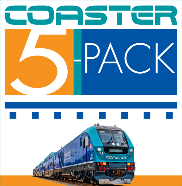 The COASTER 5-Pack offers a 40 percent discount over the COASTER Regional Day Pass. This flexible fare product can be used on any five individual days within 30 days of the initial purchase. Transfers to SPRINTER, BREEZE, FLEX, MTS Bus, Trolley, MTS Rapid and MTS Rapid Express are included. After 30 days, the pass, along with unused days, expires.